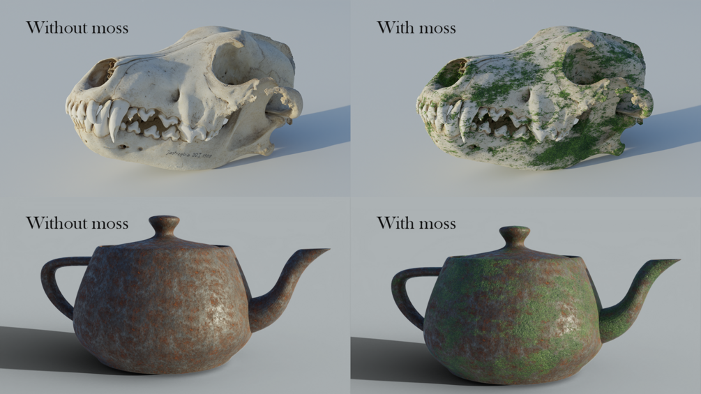 This is a procedural moss shader created in blender that works with Cycles and Eevee. It's just as simple as drop the shader between your principled BSDF and material output and you have a beautiful customizable moss shader ready to render!